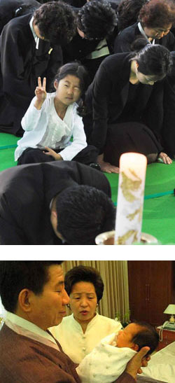 当时,卢武铉的孙女卢绪恩(音)似乎并不知道爷爷去世,显得天真无暇,这更使旁边人悲痛万分。发丧时,天真的小绪恩坐在权良淑女士旁边向遗像做出“V”型手势。