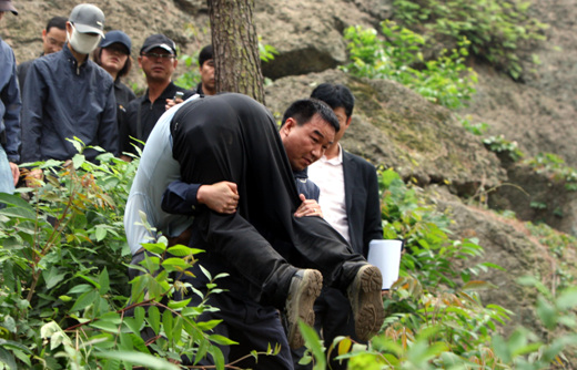 据韩国《朝鲜日报》报道,庆南警察厅2日在庆尚南道金海市峰下村后山进行了有关卢武铉逝世的现场验证,警卫戴着帽子和口罩默默地再现了当时的状况。