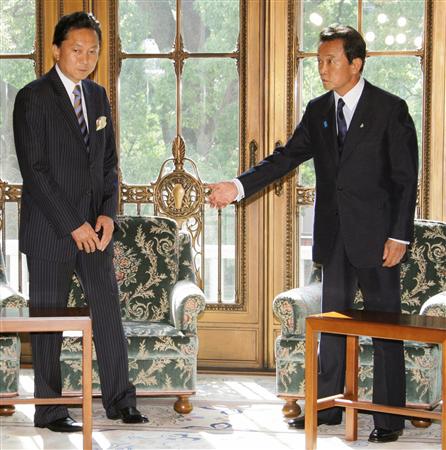 据日本《产经新闻》9月14日报道,即将就任首相的民主党代表鸠山由纪夫14日下午在国会议事堂内与麻生太郎进行了会谈。