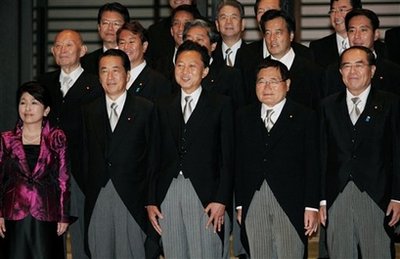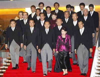中新网9月17日电 据香港《文汇报》报道,日本新任首相鸠山由纪夫16日公布其内阁成员名单,分别为:金融兼邮政改革大臣─龟井静香(72岁,国民新党党魁)、副首相兼国家战略大臣─菅直人(62岁)、首相─鸠山由纪夫(62岁) 、少子化兼消费者行政大臣─福岛瑞穗(53岁,社民党党魁)、外务大臣─冈田克也(56岁)、国家公安委员长─中井洽(67岁)、国土交通大臣─前原诚司(47岁)、财务大臣─藤井裕久(77岁)、内阁官房长官─平野博文(60岁)、防卫大臣─北泽俊美(71岁)、文部科学大臣─川端达夫(64岁)、法务大臣─千叶景子(61岁)、农林水产大臣─赤松广隆(61岁)、经济产业大臣─直山鸟 正行(63岁)、总务大臣─原口一博(50岁)、行政刷新会议大臣─仙谷由人(63岁)、环境大臣─小泽锐仁(55岁)、厚生劳动大臣─长妻昭(49岁) 。