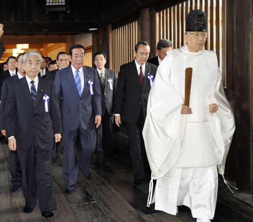 中新网10月21日电 最近几天,日本政界人士纷纷前往参拜靖国神社。19日,自民党总裁谷垣祯一进行了参拜,并称“不仅是二战,这里也祭祀着很多近代史上死去的人。是慰抚这些亡灵的心情”。20日上午,日本跨党派议员团体“大家一起参拜靖国神社国会议员会”的成员——包括日本众院副议长卫藤征士郎在内的54名众参两院议员参拜了靖国神社。