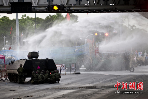 军方的装甲车进入示威者大本营,向示威者发射催泪瓦斯及开枪,还出动至少2架直升机协助驱散行动。另外,军队设立检查站封锁了一些路段,禁止车辆通行。大约1000名泰军士兵参加了此次行动。