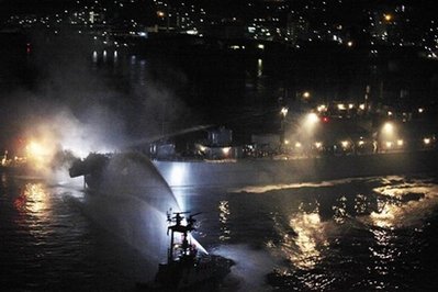 综合此间报道,事发现场位于连接福冈县北九州市与山口县下关市两市的关门桥正西约一公里的海面。两船相撞后,KURAMA号的船头和“CARINA STAR”号的集装箱同时起火,火势在半个多小时后得到控制,至少有三名自卫队成员在救火过程中受伤。