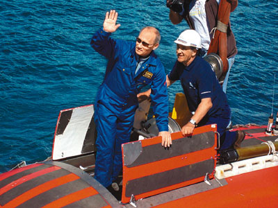 根据国营电视台发出的照片,可见身为柔道黑带高手的普京身穿蓝色工作服,攀上Mir-1潜艇开始航程。普京在船舱表示:“这次潜水很顺利,视野在灯光下很好。”但他对水显得污浊有微言:“从生态角度看这些水当然干净,但事实上这是浮游生物汤,起码我是这样叫它。”