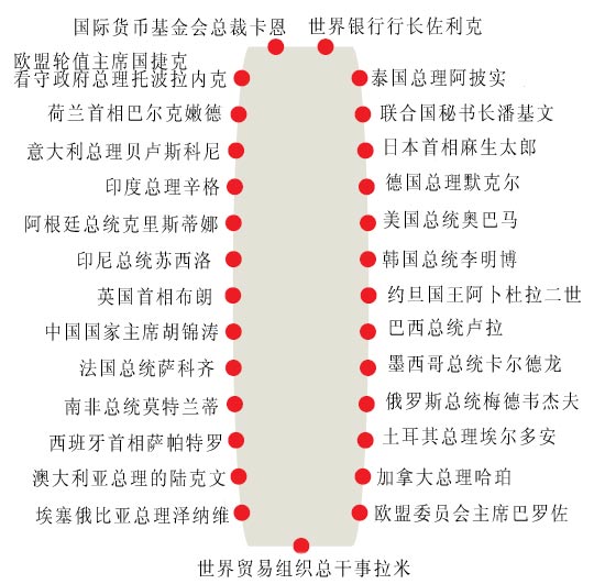 为体现此次峰会的代表性,一些国际和区域组织的领导人也应邀出席了此次峰会,诸如世界银行行长佐利克、世贸组织总干事拉米和国际货币基金组织总裁卡恩等。据悉,佐利克、卡恩及拉米三人分坐在宴会桌的两头。
