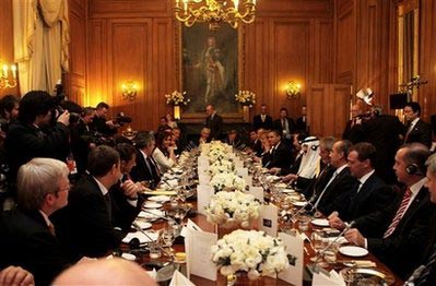 据《卫报》4月2日披露,作为东道主,英国首相布朗坐在了椭圆形宴会桌主人应该坐的位置上,中华人民共和国主席胡锦涛坐在他右侧,印尼总统苏西洛坐在布朗的左侧,约旦国王阿卜杜拉二世坐在布朗的正对面。据悉,布朗将私下会晤阿卜杜拉,两人将就两国之间的军火交易进行商谈。法国总统萨科齐被安排坐在胡锦涛的右侧。俄罗斯总统梅德韦杰夫被安排坐在墨西哥总统卡尔德龙和土耳其总理埃尔多安之间。