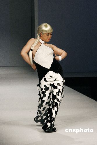2007年11月4日,中国国际时装周举行半狄熊猫时装发布会。芙蓉姐姐以模特身份展示了半狄熊猫时装“网络红人”造型,首次在中国国际时装周亮相的芙蓉姐姐在T台上大秀“S”造型,由于时装上身过小,芙蓉姐姐在尽情舞蹈中胸部大泄春光。中新社发 鲁谷 摄