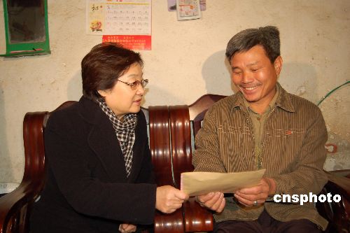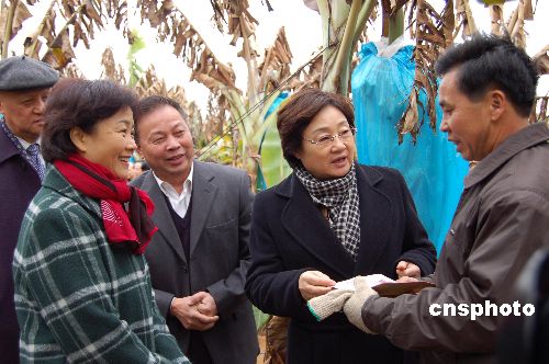 2月3日上午,中国国务院侨办主任李海峰女士一行到遭受冰冻灾害的广西南宁隆安县浪湾华侨农场,考察灾情,慰问受灾归侨。李海峰还代表国务院侨办和海外侨胞,向该农场灾民捐赠三万元人民币。此前2月2日晚,国侨办“侨爱温暖行动”向广西捐赠一百万元人民币。中新社发 刘万强 摄