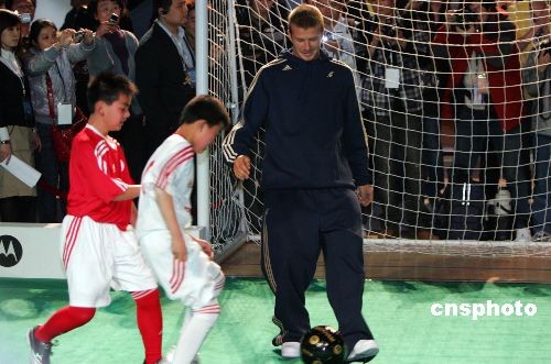 3月3日,足坛巨星贝克汉姆在上海出席中国球迷见面会,并与在沪进城务工子弟“交流球技”。中新社发 汤彦俊 摄