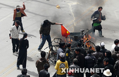 3月14日,一群不法分子在西藏自治区首府拉萨市区的主要路段实施打砸抢烧,焚烧过往车辆,追打过路群众,冲击商场、电信营业网点和政府机关,给当地人民群众生命财产造成重大损失,使当地的社会秩序受到了严重破坏。事后查明,这天,不法分子纵火300余处,拉萨908户商铺、7所学校、120间民房、5座医院受损,砸毁金融网点10个,至少20处建筑物被烧成废墟,84辆汽车被毁。有18名无辜群众被烧死或砍死,受伤群众达382人,其中重伤58人。拉萨市直接财产损失达24468.789万元。