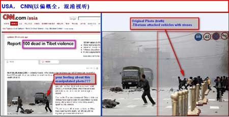 同样在17日,美国有线电视新闻网(CNN)和法新社在各自网站上使用了一张描述一辆车正向两名平民驶来的图片,虽然CNN网站的图片说明写的是“藏人向军车投掷石块”,但图中却看不见类似场景。事实上,当时军车旁有约10名暴徒在向军车投掷石块,只是CNN和法新社未选取这种客观描述暴徒恶行的照片。