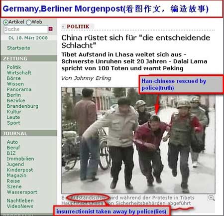 类似的“张冠李戴”还有不少。德国《柏林晨报》网站18日将一张西藏公安武警解救被袭汉族人的照片硬说成是在抓捕藏人;美国福克斯电视台网站刊登图片称,中国军人将藏人抗议者拉上卡车,可图片中明明是印度警察。德国NTV电视台也在报道中将尼泊尔警察抓捕藏人抗议者说成是“发生在西藏的新事件”。