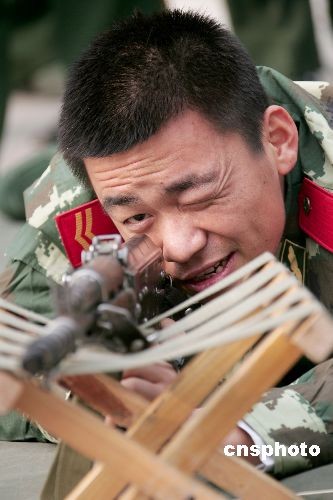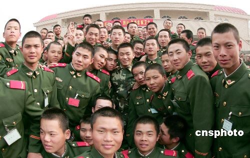 3月21日,《士兵突击》中扮演许三多的新星王宝强,应邀来到武警河北总队邢台市支队新训大队,与新兵面对面交谈,共话军旅人生。中新社发 余洪恩 摄