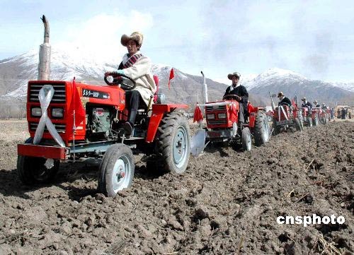 3月26日,拉萨市达孜县德庆镇桑珠村的农牧民们穿上节日盛装,用政府新支援的拖拉机开始春耕生产。藏族农牧民一年一度的春耕并没有受到拉萨“3.14”打、砸、抢、烧暴力事件的影响。中新社发 周波 摄