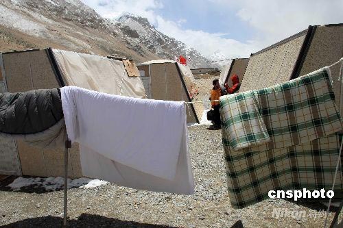 5月4日,在连续降雪后,住在珠峰大本营绒布新闻中心简易屋的中外记者,抓住短暂晴天晾晒睡袋和被子。中新社发 盛佳鹏 摄