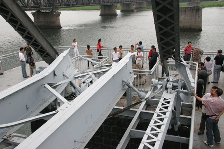 中新网7月2日电 7月1日,2008全国网络媒体辽宁行记者采访团来到那曾经战火纷飞的鸭绿江断桥参观。鸭绿江端桥为鸭绿江上诸多桥中第一座桥,1909年5月动工,1911年10月竣工。由当时日本朝鲜总督府铁道局所建。始为铁路桥,12孔,长944.2米。从中方数第4孔为开闭梁,以4号墩为轴,可旋转90°,便于过往船只航行。