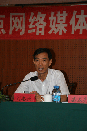 中共锦州市委书记刘志强向全国网络媒体记者介绍锦州的发展状况。