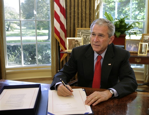 在去财政部探望了那里的工作人员,并鼓舞他们的士气后,布什回到他白宫的椭圆形办公室,签署了这个史上规模最宏大的救市法案。他还特地邀请了各大媒体的摄影记者,记录下这历史一刻。