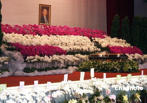 台塑企业创办人王永庆的遗体十七日由长荣班机运抵台湾,灵堂设在桃园县的长庚大学活动中心。图为棺木安放在灵堂内景。中新社发 耿军 摄