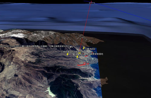 图片中红色直线为火箭弹道,蓝色直线是民航客机航线。