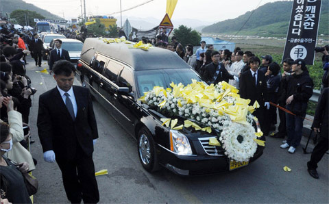 中新网5月29日电 据朝鲜日报报道,当地时间29日凌晨5时(北京时间4时),韩国已故前总统卢武铉的出殡仪式在庆尚南道金海市进泳邑峰下村举行,遗属、葬礼委员们和数千名吊客为他送行。