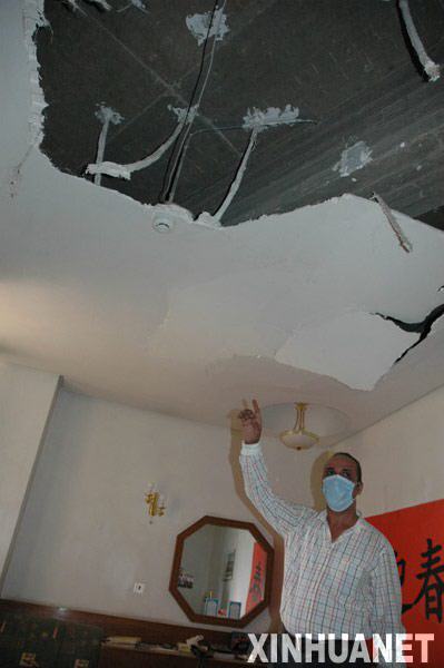 就在拿到相机转身的一瞬间,第二声巨响响起,整个大楼剧烈颤抖起来,阳台的玻璃门爆裂,无数的碎玻璃打在记者刚离开的办公桌前。阳台上的卫星电话、办公桌上的英文字典和地上的垃圾桶被气浪掀飞起来,记者也被气浪掀倒在沙发后。铝合金门框整个砸到墙上。记者的头顶碎石乱飞,天花板出现了3个大窟窿,落下的天花板砸在记者床上。楼道里传来其他房间的天花板和门窗倒塌之声,呛人的烟雾充满整个楼道。