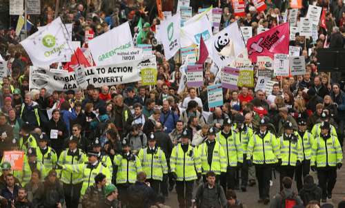 示威者行经国会大楼,吹响哨子,大喊“我们憎恨银行”,标语五花八门,有“人民为先、利润居后”、“离开伊拉克和阿富汗”等,部分语句则较为激进,如“问吊银行家”、“冲击银行”。当他们行至唐宁街的首相府时,纷纷报以嘘声。