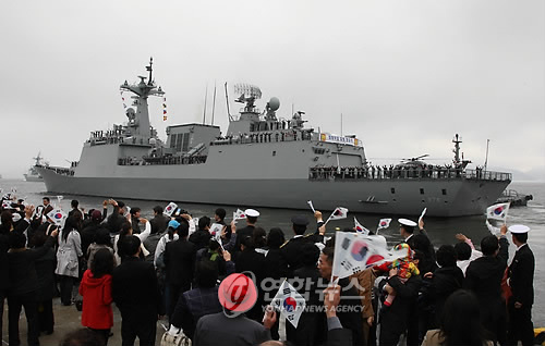 中新网3月13日电 据韩联社报道,韩国“青海部队”13日启程前往索马里海域。该部队第一艘派兵舰艇——韩式驱逐舰(KDX-Ⅱ)“文武大王舰”,当天上午在镇海军港举行了出港及欢送仪式。