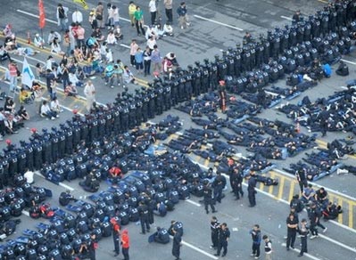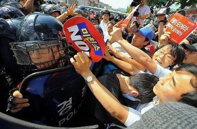 韩国防暴警察与抗议政府恢复进口美国牛肉的民众对峙。