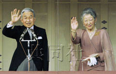 图为日本天皇、皇后正在向前来祝贺的人们挥手致意。
