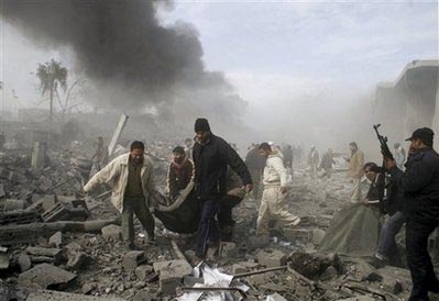 以色列发动的空袭行动摧毁了数个哈马斯警察的院落,死伤者倒在地上。这是巴勒斯坦人20多年来所遭遇的最血腥的一天。
