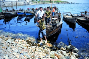 昨日,在大连港事故现场的海面上,十多艘海事清污船正在作业。当天的清污工作主要由海事部门组织,大连军分区派出1100名官兵、200名民兵参与清理。