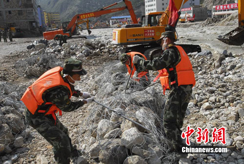 自8月8日以来,武警水电部队500余名官兵和130余台大型机械设备日夜连续奋战在舟曲白龙江堰塞体抢险一线,他们采取“挖、装、运”相结合、调运长臂反铲深掏、人工安装铁丝笼固定护坡等作业方式,疏通河道,加快白龙江存水泄流速度,尽快消除洪水隐患。
