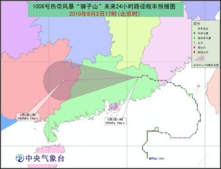 今年第6号热带风暴“狮子山”的中心于9月2日11时由福建省诏安县移入广东省饶平县境内,17时“狮子山”位于广东省兴宁市境内,就是北纬24.1度、东经115.7度,中心附近最大风力有8级(18米/秒),中心最低气压为995百帕。