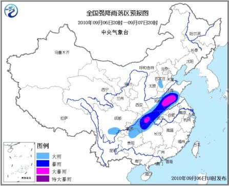 9月6日20时到7日20时,山东中南部、安徽北部、江苏北部、河南东部和南部、湖北中西部、重庆中东部、贵州北部、湖南西北部以及川西高原东南部、河北西南部等地有大雨或暴雨,其中,湖北西南部、河南中部偏东地区、山东西南部、安徽北部、江苏西北部等地局部有大暴雨;上述部分地区并伴有短时雷雨大风等强对流天气。