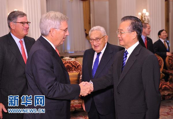 当地时间9月22日上午,在纽约华尔道夫饭店一间宽敞的会议室里,温家宝总理望着坐在身旁的基辛格,以40多年来中美关系的发展入题,与美国企业、金融和学术界一些著名人士展开座谈和交流。