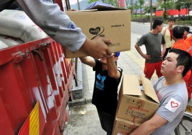 4月25日,芦山县城志愿者包办了许多发放接送物资的体力活。