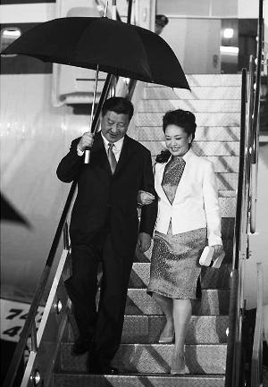 当地时间晚7时10分许,习近平乘坐的专机抵达西班牙港皮亚科国际机场。这是中国最高领导人首次对特立尼达和多巴哥以及英语加勒比国家进行国事访问。特立尼达和多巴哥总统卡莫纳夫妇、总理比塞萨尔冒雨亲自到机场迎接习近平和夫人彭丽媛的到来。