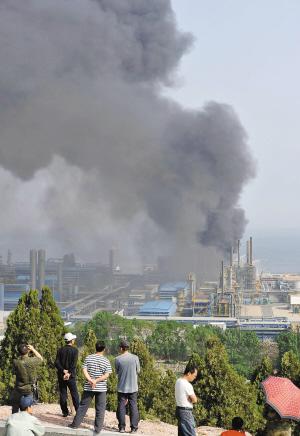 6月2日,中石油大连石化分公司厂区因爆炸冒出滚滚黑烟。