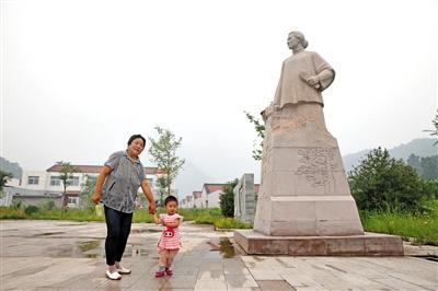 昨日,密云县张家坟村,邓玉芬的孙媳妇带着孙女在邓玉芬雕像前。新京报记者 王远征 摄