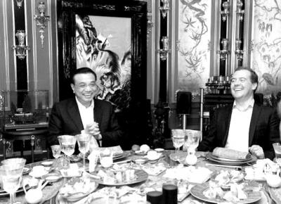 13日当天,李克强与梅德韦杰夫举行了四次会面——小范围会谈、大范围会谈、欢迎午宴、私人晚宴,相处时间超过10个小时。