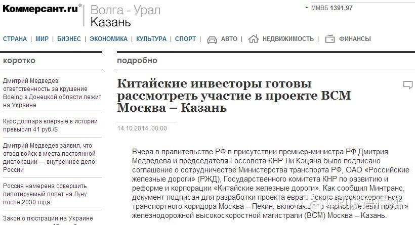 俄罗斯主要商业化报纸之一“生意人报”:中国参与俄罗斯的高铁项目,这是李总理访问期间最受关注的话题之一。如果连接中国、俄罗斯和哈萨克斯坦的高速铁路网建设顺利推进,将极大促进“丝绸之路经济带”战略的实施。