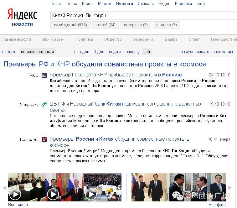 俄罗斯最大的搜索引擎Yandex.ru:当在这里输入“中国”、“俄罗斯”、“李克强”等词条的时候,你能够看到数以千计的消息,内容涵盖了李总理访俄期间的所有活动与话题。