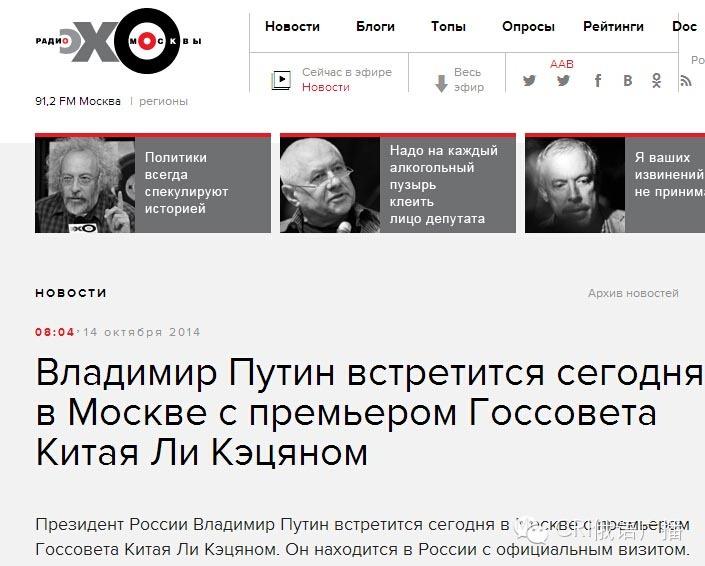 “莫斯科回声”广播电台:在会见李克强时,普京表示,将在亚太经合组织成员国领导人非正式会晤期间,与习近平主席在北京举行会晤。在不到一个月的时间内,两国高层领导先后会面,其重要意义不言而喻。