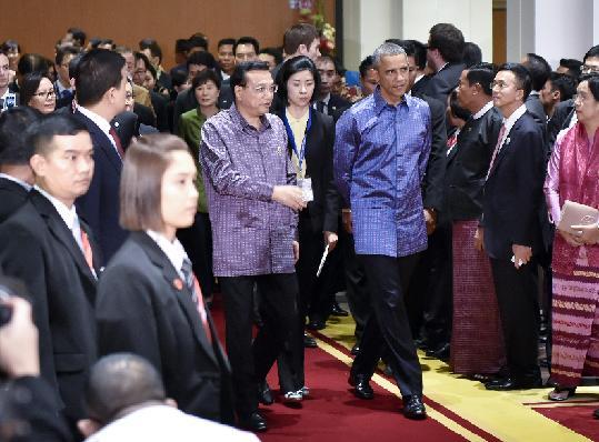 晚宴前,18位与会国领导人和潘基文身着缅甸特色服饰,站在印有缅甸名胜大金寺、大金石图案的背景板前合影,克强总理站在正中间,“东道主”吴登盛一边是奥巴马,一边是克强总理,足见主办方对中国的重视。