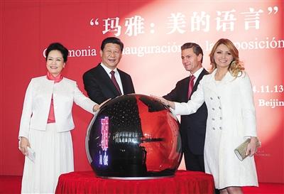 昨日,国家主席习近平同墨西哥总统培尼亚共同出席在国博举行的“玛雅:美的语言”文化展开幕式。 新华社记者 刘卫兵 摄