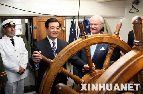 中新网瑞典哥德堡6月9日电 中国国家主席胡锦涛9日同瑞典国王卡尔十六世·古斯塔夫一同出席了隆重盛大的“哥德堡”号仿古船返航仪式。