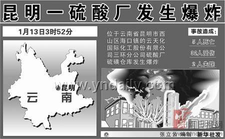 昨日凌晨3时50分许,昆明市西山区海口镇云天化国际化工股份有限公司三环分公司硫酸厂硫磺仓库,在硫磺装卸过程中,硫磺粉尘发生爆炸并起火燃烧。事故共造成5人死亡,32人受伤,两人失踪。