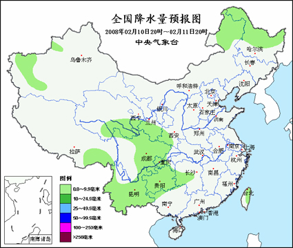10日20时至11日20时,新疆天山西部和南疆西南部、西藏东南部、青海东南部、西北地区东南部、川西高原北部、云南东北部以及内蒙古东北部、黑龙江中北部等地阴有小到中雪或雨夹雪,其中,西藏东南部、青海东南部、甘肃西南部等地的局部地区有中到大雪;四川盆地大部、重庆西南部、贵州、云南中南部、湖南西部以及台湾东北部等地阴有小雨或雨夹雪,其中,贵州中西部的部分地区有冻雨。内蒙古中东部、华北大部、东北、黄淮东部等地有4~6级偏北或偏西风;东部和南部海区将有6~8级偏北风。