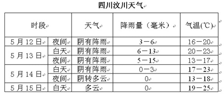 其他受到汶川地震波及的地区,重庆13日20时至15日20时,将有阵雨或雷阵雨,雨量以小到中雨为主。